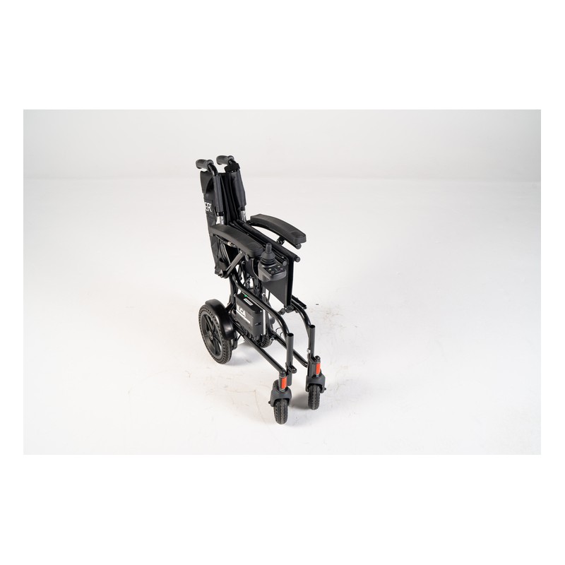 Su estructura plegable tipo maleta y sus reducidas dimensiones (solo 70 cm de profundidad sin reposapiés) la hacen perfecta tanto para interiores como para exteriores. Equipada con dos motores de 150W, alcanza una velocidad máxima de 6 km/h y permite superar pendientes con facilidad.